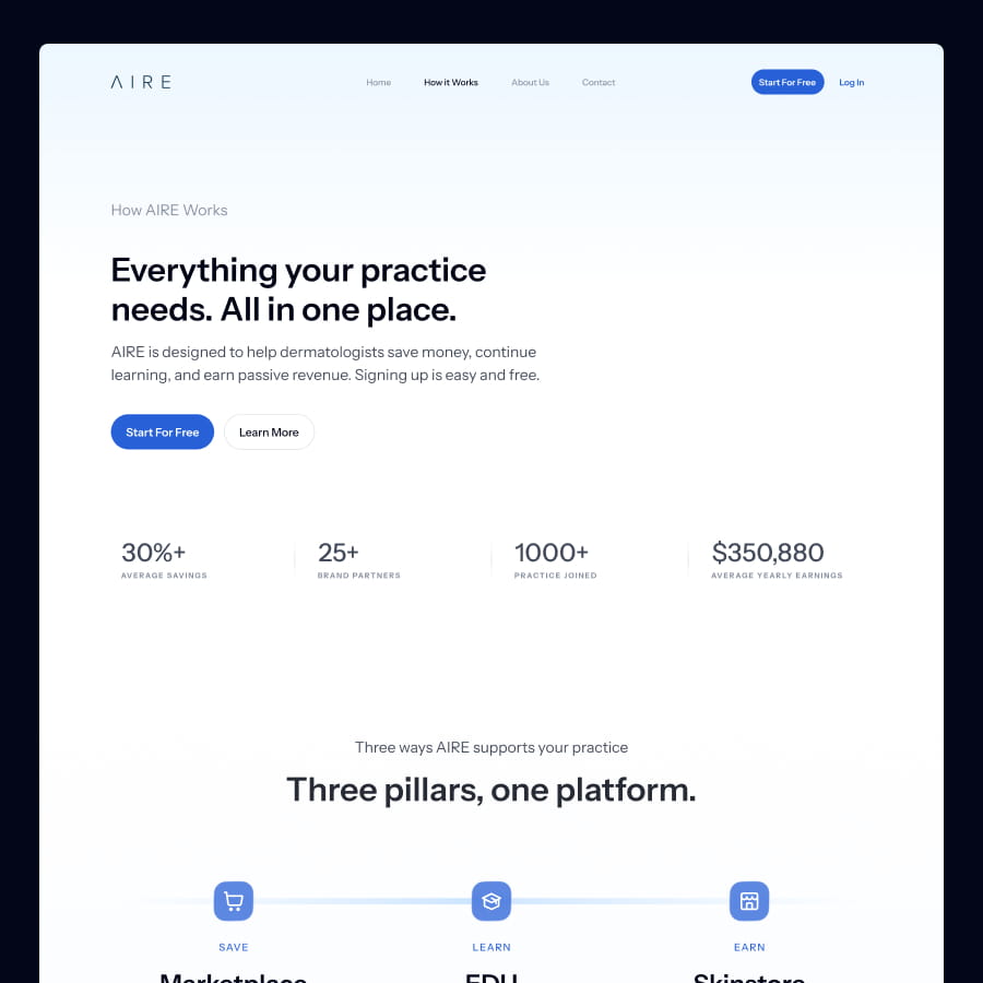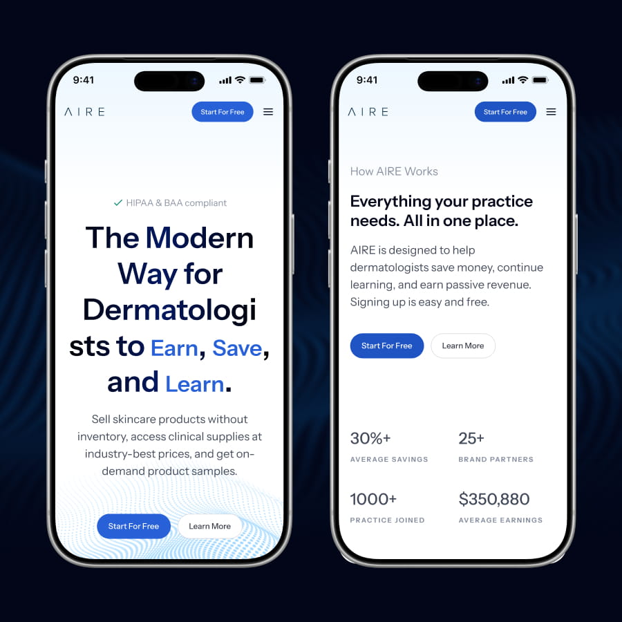 Through a comprehensive UX audit and redesign, AIRE’s website has been transformed into a clear, user-focused platform that communicates value, guides diverse audiences, and builds trust. By streamlining messaging, establishing intuitive navigation, and highlighting tailored pathways for dermatologists, residents, and brands, the site now reduces friction and encourages engagement at every stage.