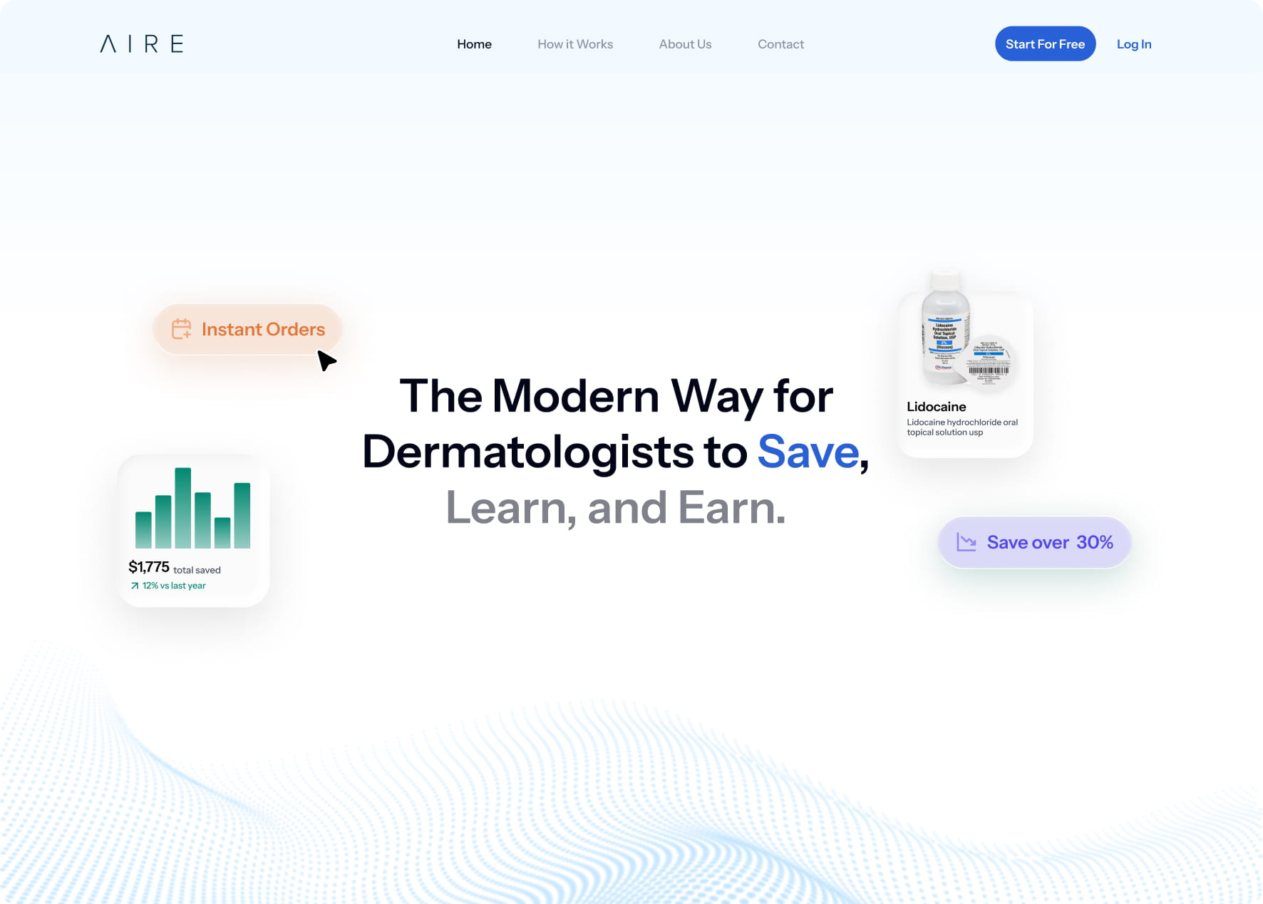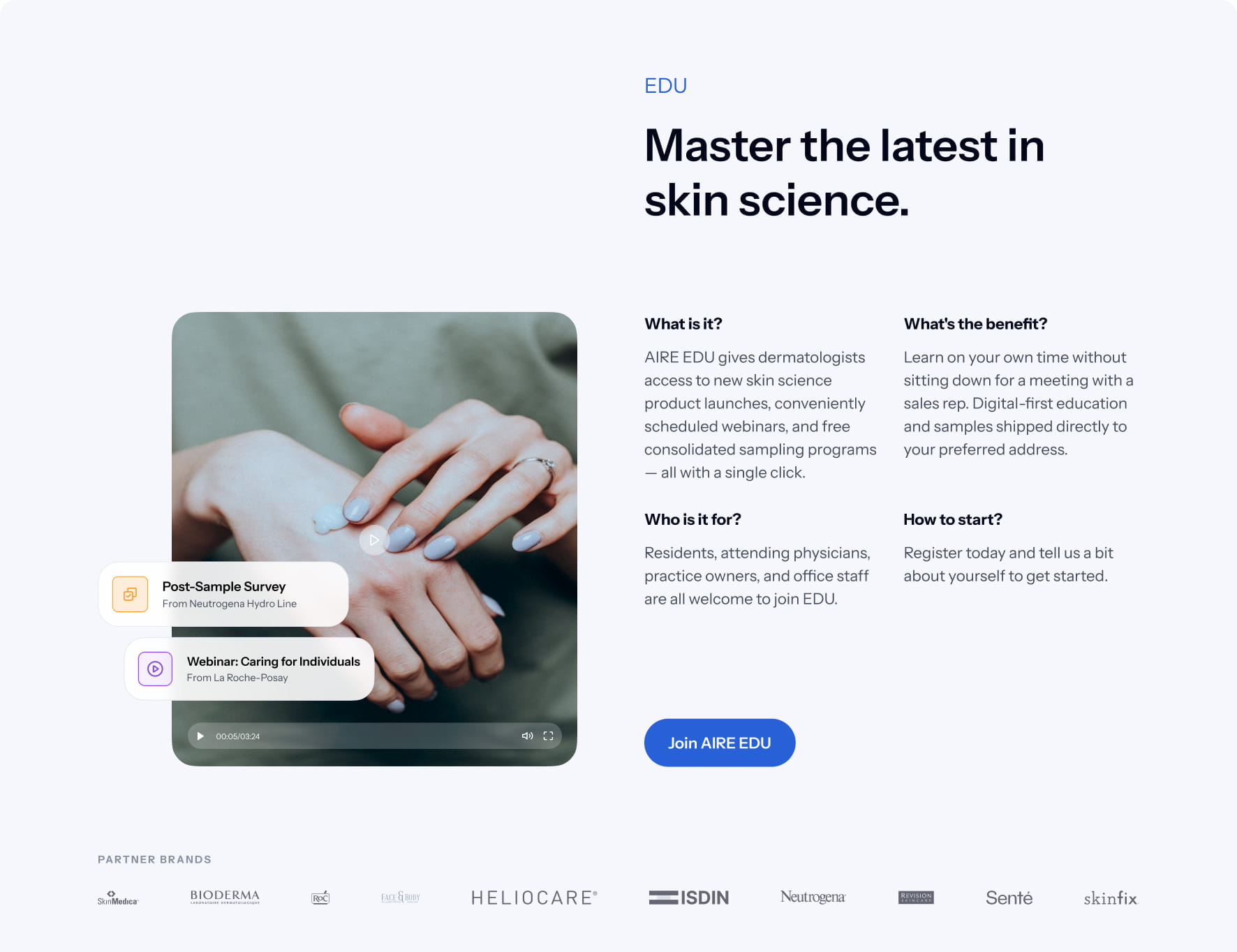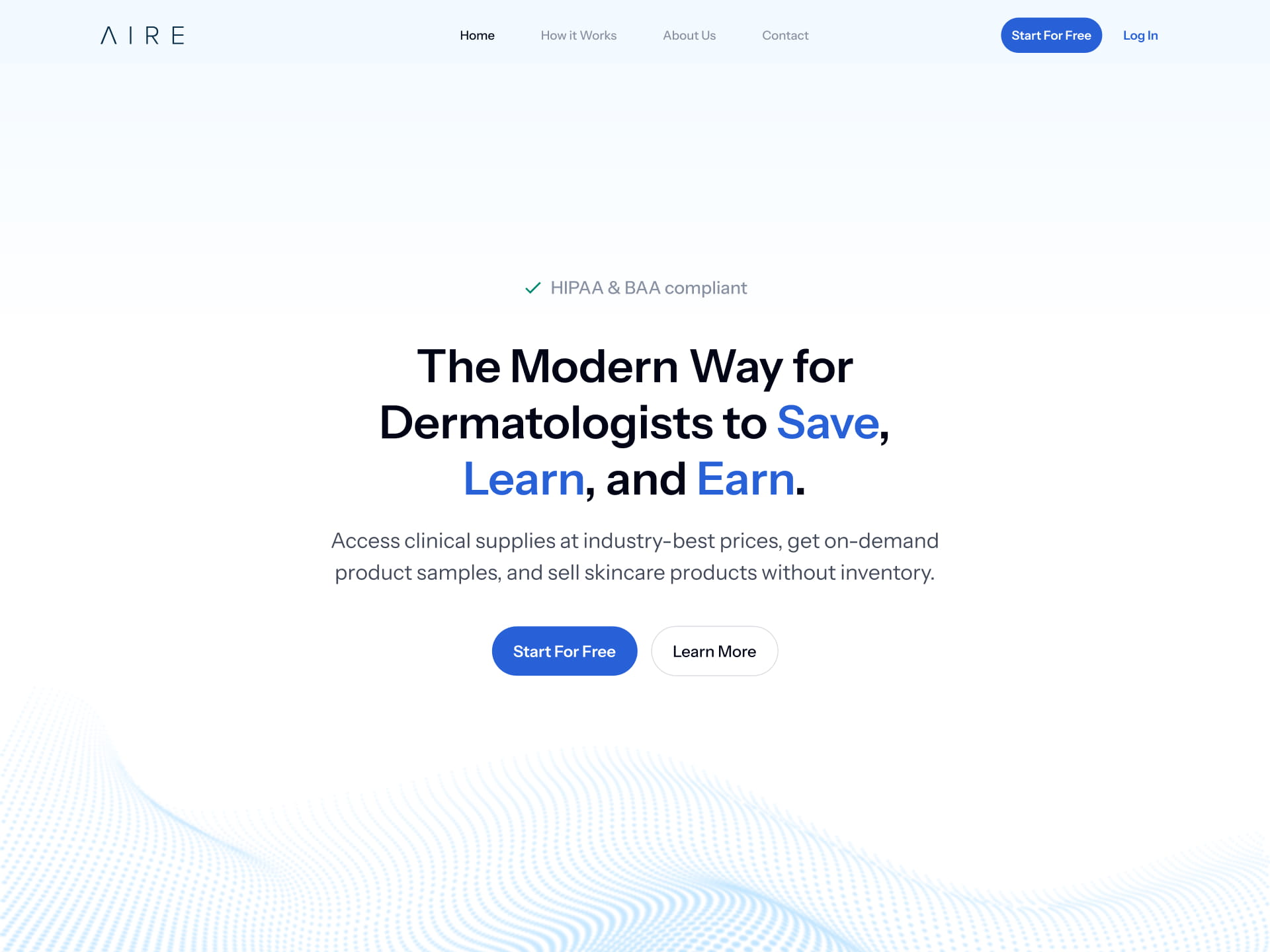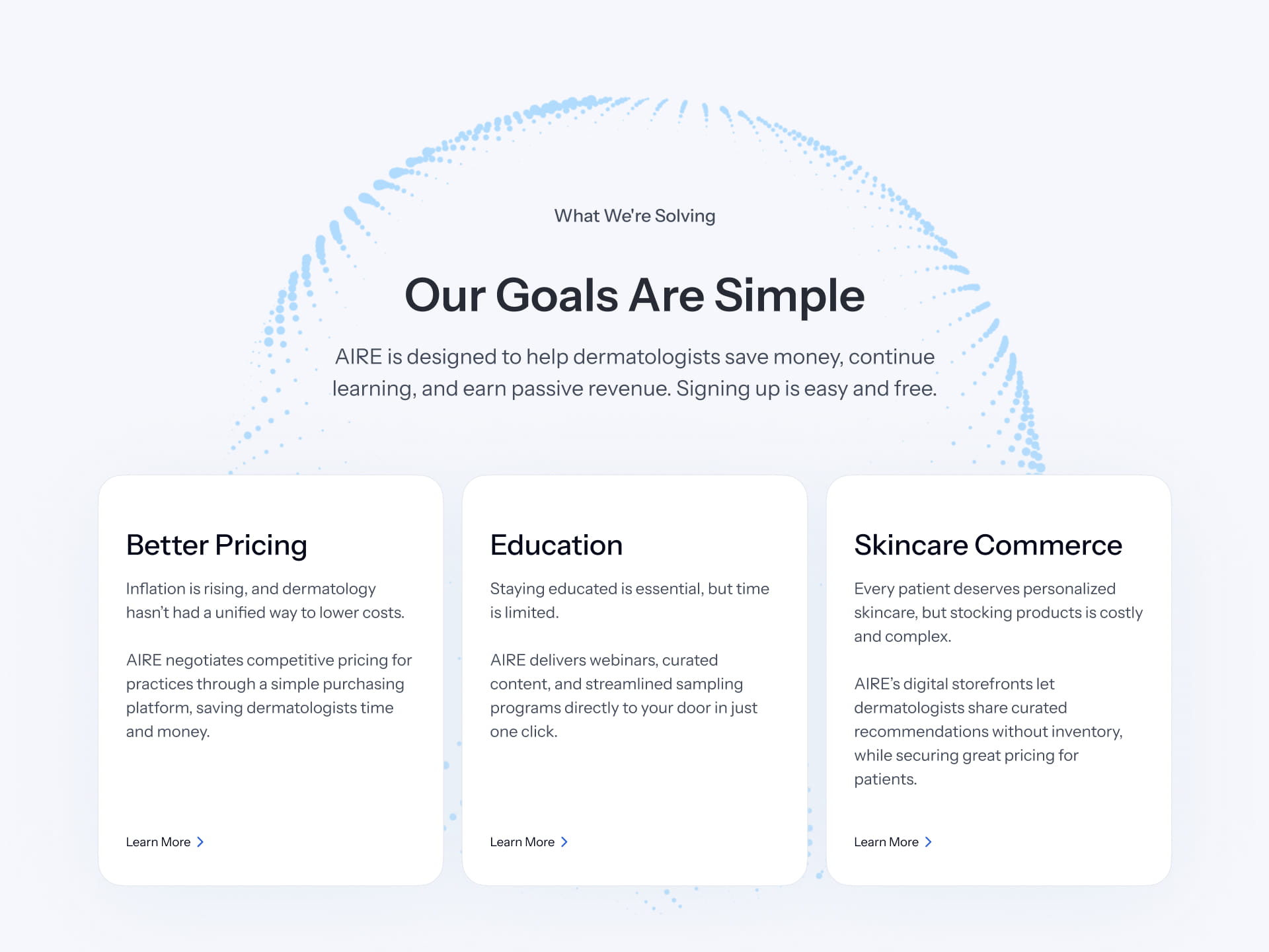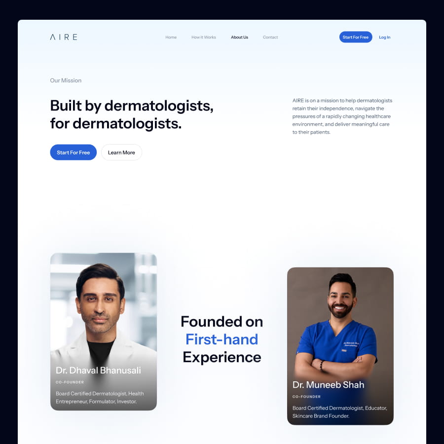 AIRE’s website serves a diverse audience of dermatologists, residents, and skincare brands, but the original design struggled to clearly communicate the platform’s value and guide users toward meaningful actions. The goal of this redesign was to create a homepage that delivers a clear, consistent message, simplifies navigation, and provides tailored experiences for each user type.