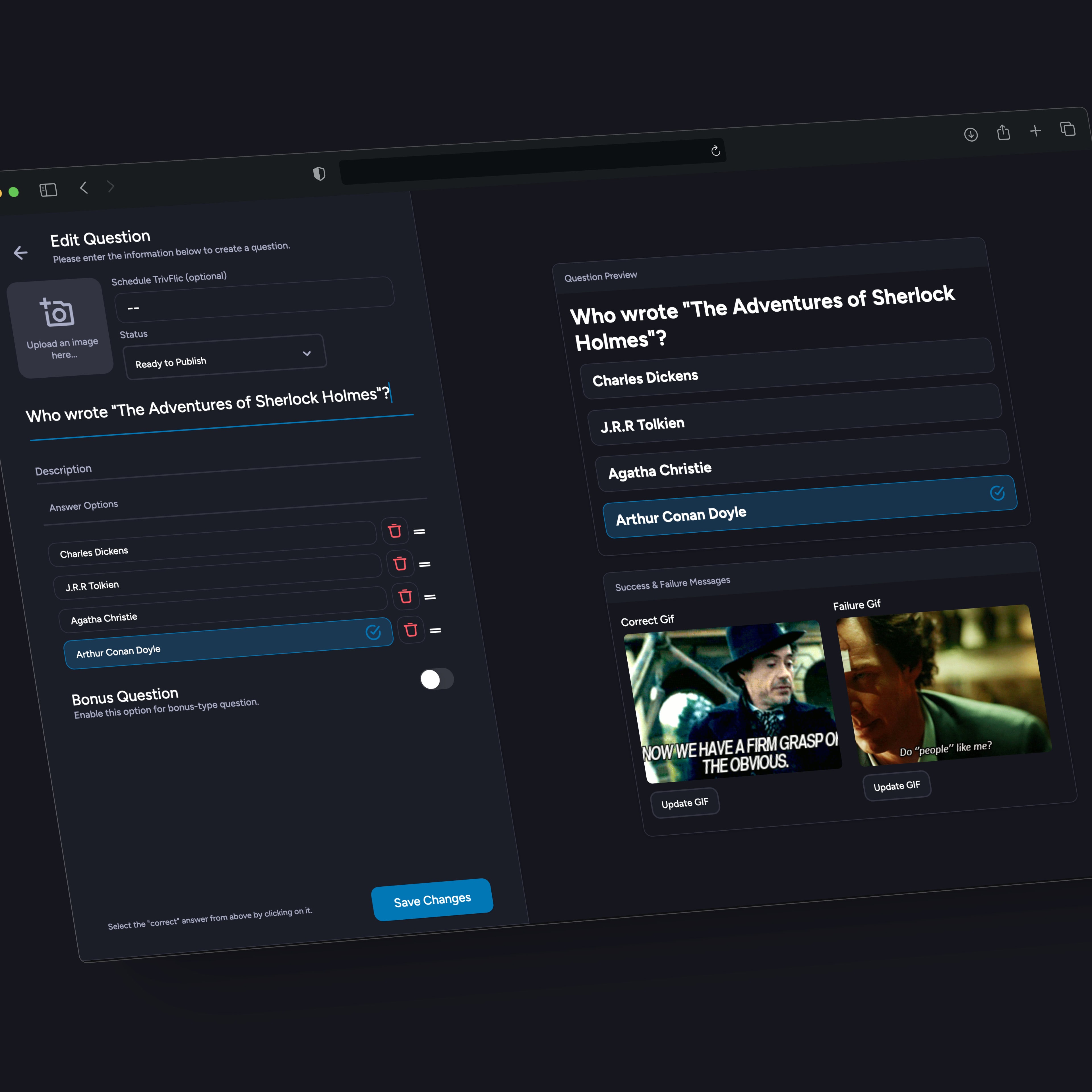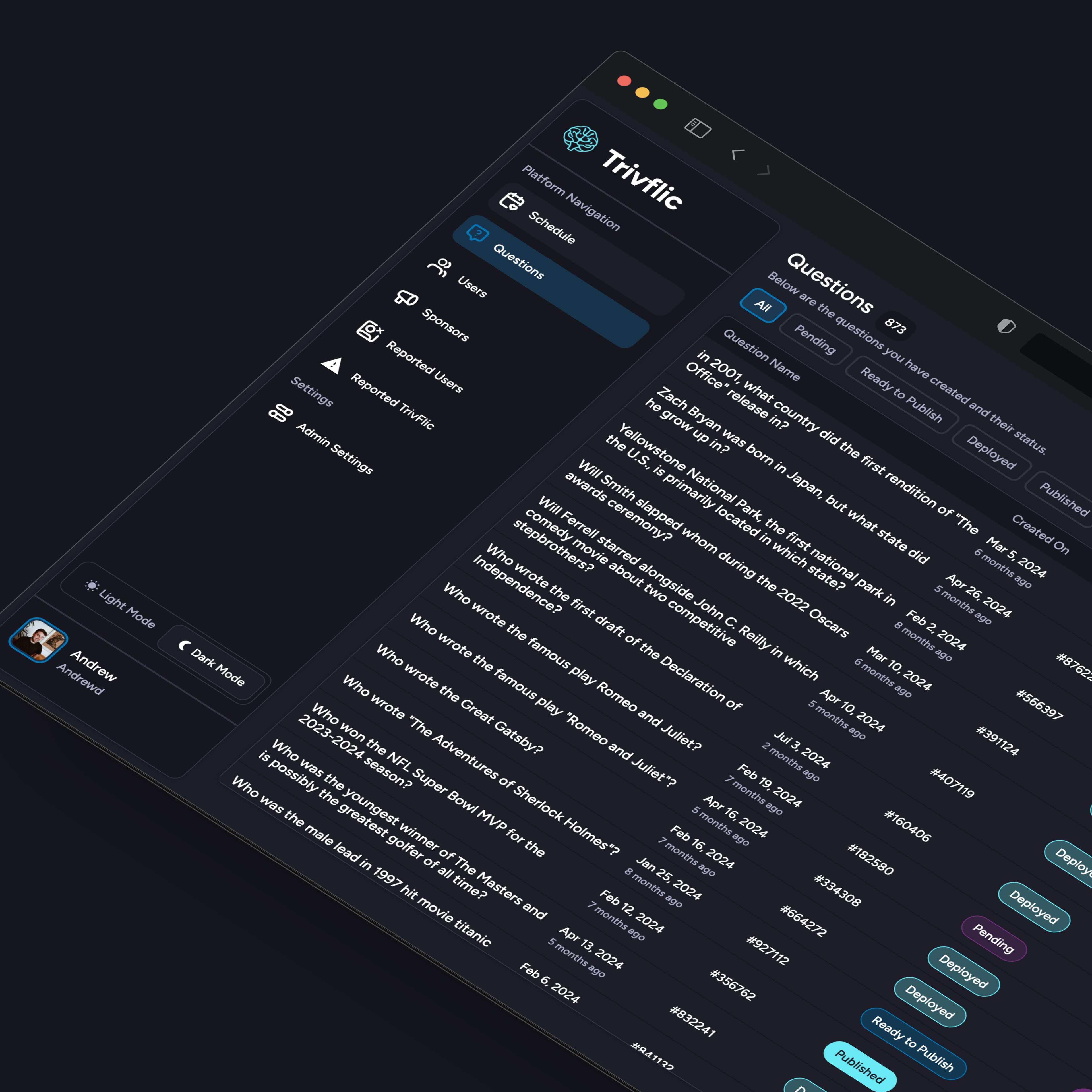 With any good platform you need a way to moderate and create content to push out to your users, we helped the Trivflic team create a moderation tool that allowed them to also create and manage trivia questions to push out to their audience as well as a custom push notification center.